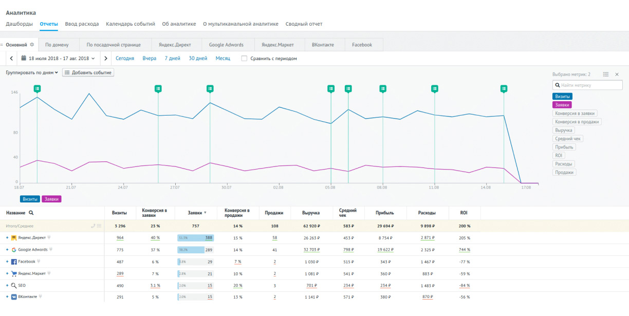В первую очередь, до активации рекламной кампании сайт проверяем через аналитический сервис Roistat. Он позволяет отслеживать каналы для продвижения предприятия лёгкой промышленности – конверсию и другие показатели эффективности.